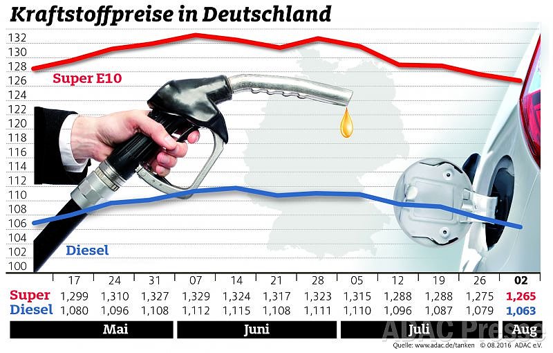 Die Spritpreise sind auch in dieser Woche leicht gesunken. Laut ADAC-Auswertung kostet der Liter Super E10 durchschnittlich 1,265 Euro, das ist ein Rückgang um 1,0 Cent. Der Liter Diesel verbilligte sich binnen Wochenfrist um 1,6 Cent und liegt bei 1,063 Euro...