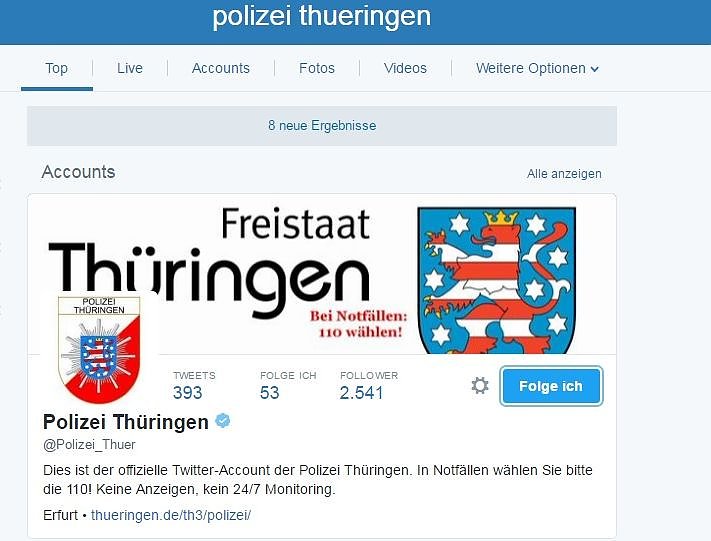 An dieser Stelle sei allerdings darauf hingewiesen, dass die Social Media Accounts der Thüringer Polizei nicht als Notrufportale dienen und bedient werden. In Notfällen wenden sie sich bitte weiterhin an die Rufnummer 110 oder ihre nächstgelegene Polizeidienststelle. Auf Facebook findet man die Fanpage unter Polizei Thüringen oder man besucht die Berufs- und Einstellungsberatungsseite des Bildungszentrum der Thüringer Polizei. Der Twitteraccount ist unter @Polizei_Thuer zu finden. In diesem Sinne: Follow Polizei Thüringen!