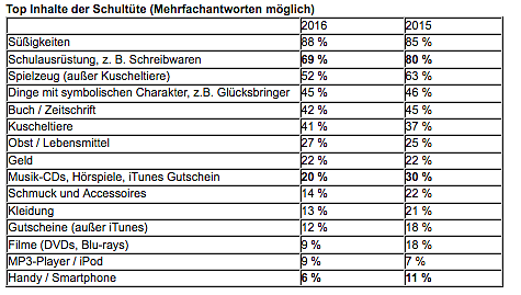 Die Mütter und Väter von jedem siebten Kind (15 Prozent) sind vermutlich über den ganzen Einschulungsstress jedoch so beschäftigt, dass sie einfach eine fertig gefüllte Zuckertüte kaufen. Nur ein Prozent der Eltern hält nichts von der Tradition und schenkt seinem ABC-Schützen gar keine Schultüte.