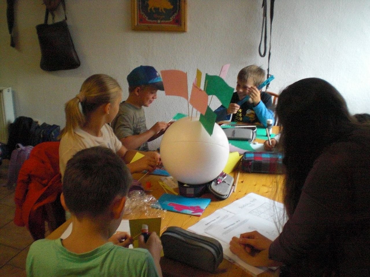 Dort galt es verschiedene Stationen zu durchlaufen. Neben Pizza backen, Gestaltung einer Klassenflagge, der Vervollständigung der Raupe Ronny (Erwartung und Wünsche der Schüler) sowie das Aufstellen der Klassenregeln als Fähnchen auf einer Styroporkugel, war das Herstellen einer eigenen Holzablage für das Klassenzimmer der Höhepunkt des Tages. Ebenso aufregend war der Abschluss des Tages mit einer tierischen Führung durch die Landwerkstatt. Dieser gemeinsame Kennenlerntag hat dazu beigetragen, dass die neu gemischten Fünftklässler die Gelegenheit bekamen, sich auszutauschen und gemeinsam etwas für das kommende Schuljahr zu erarbeiten.