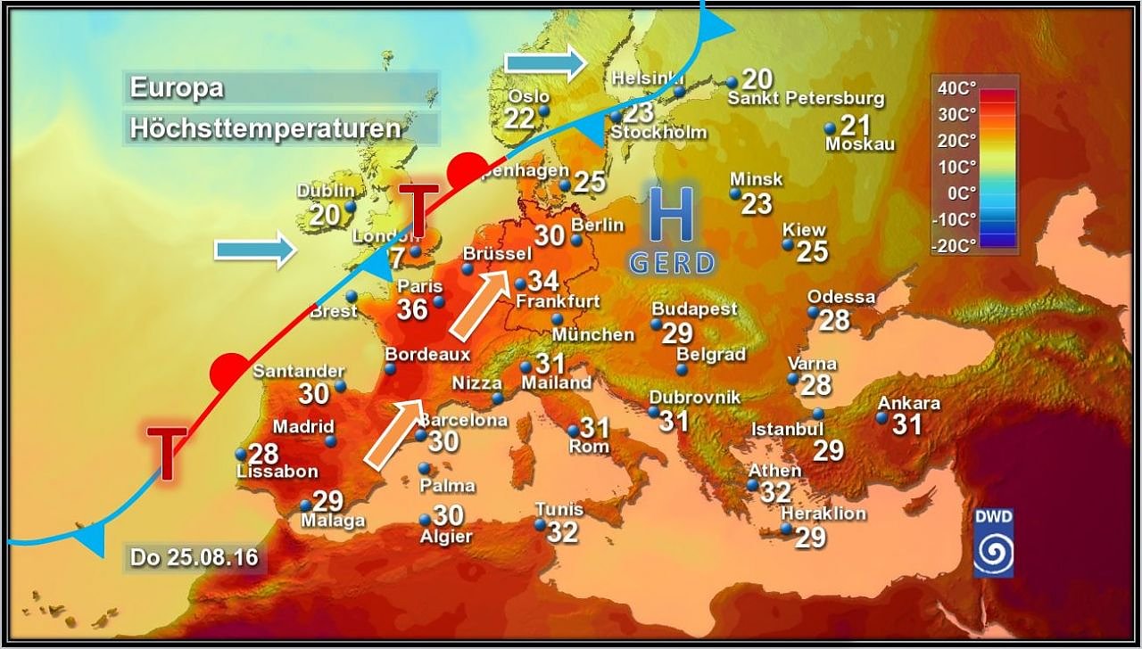 Es ist höchstwahrscheinlich nicht nur die letzte Hitzewelle des Jahres, vielerorts ist es wohl auch die längste. Verantwortlich dafür zeigt sich eine stabile Großwetterlage, die durch ein kräftiges Hochdruckgebiet mit dem Namen GERD gekennzeichnet ist. GERD liegt mit seinem Schwerpunkt am heutigen Donnerstagmorgen zwar bereits über Nordpolen, beeinflusst aber weiterhin den überwiegenden Teil des Landes - und das voraussichtlich bis Sonntagmittag. Die herangeführte sudeuropäische Subtropikluft ist zu Beginn noch trocken, wird zum Wochenende aber feuchter und damit schwüler.