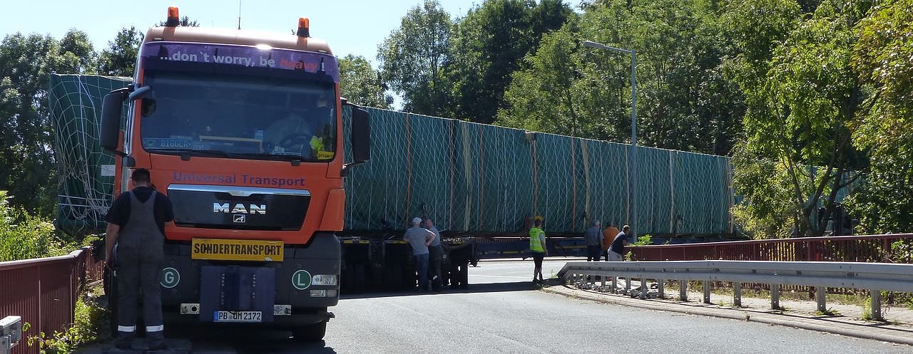 Die Experten hatten hatten ihre Rechnung ohne das Brückengeländer gemacht. Nun muss das Geländer abgebaut werden, damit der 68 Meter lange Transport "rumkommt. Wir werden über die Geschichte des Transport weiter berichten.