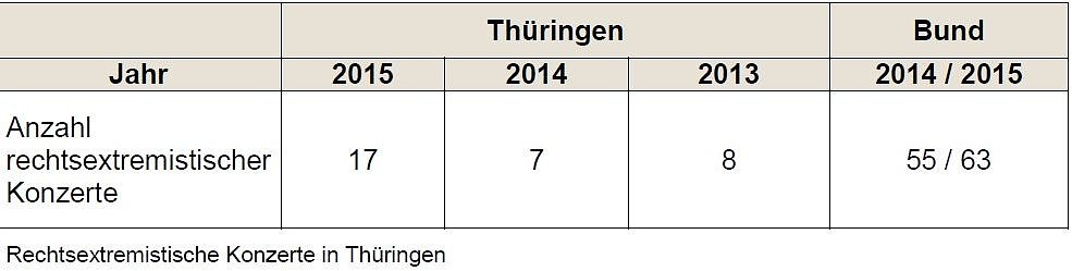 Die Zahl der rechtsextremistischen Konzerte in Thüringen lag im Jahr 2014 in etwa auf dem Niveau des Vorjahrs. Im Jahr 2015 verdoppelte sich die Anzahl der Konzerte auf 17 im Vergleich zum Vorjahr. Ein leichter Rückgang war bei der Zahl rechtsextremistischer Liederabende auf sechs (2014: 9) festzustellen.