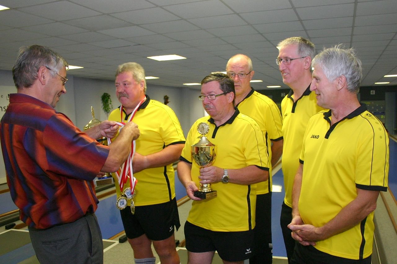 Mit 73 Holz Vorsprung für den NSV nach dem ersten Paar zeigten sich die Oberroßlaer aus der Nähe von Apolda noch ganz zufrieden. Im zweiten Paar aber wurde es dann aber doch noch sehr heftig für die Gäste. Nordhausen überzeugte durch mannschaftliche Geschlossenheit auf hohem Niveau. Nach der Partie gab es für den NSV dann noch eine späte Ehrung. Dr. Rolf Schubert, Vizepräsident des Thüringer Kegler-Verbandes, überbrachte nachträglich den Meisterpokal und die Medaillen verbunden mit den herzlichsten Glückwünschen zum Gewinn der Türinger Landesmeisterschaft 2015/16 (siehe Bild).