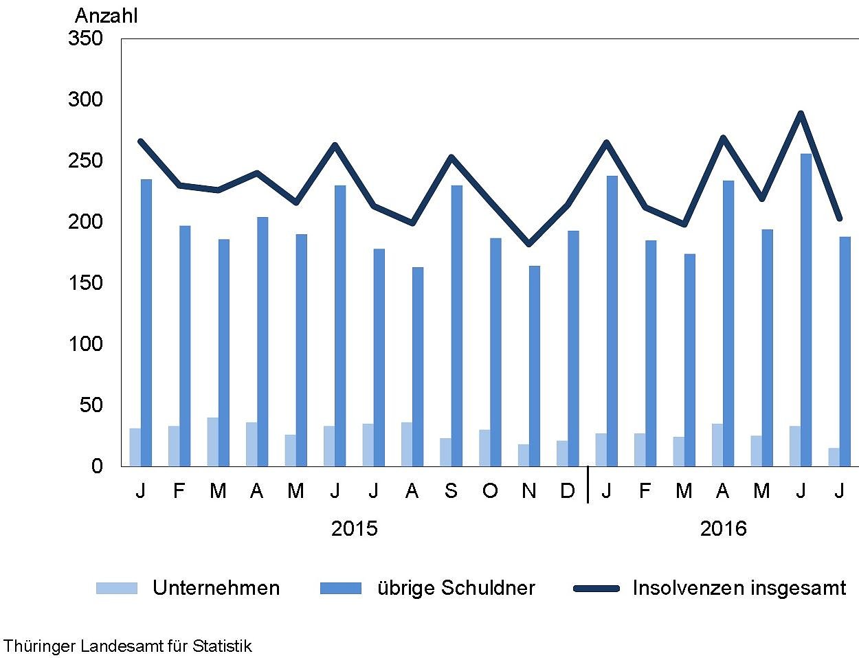 insolvenzen verringerte sich in den ersten sieben Monaten 2016 gegenüber 2015 um 48 Verfahren bzw. 20,5 Prozent auf 186 Unternehmen. Diese insolventen Unternehmen beschäftigten zum Zeitpunkt des Antrages noch 756 Arbeitnehmer. Der wirtschaftliche Schwerpunkt der Unternehmensinsolvenzen lag mit 42 Verfahren im Bereich Handel, Instandhaltung und Reparatur von Kraftfahrzeugen, gefolgt vom Baugewerbe mit 36 Verfahren und dem Verarbeitenden Gewerbe mit 26 Verfahren.