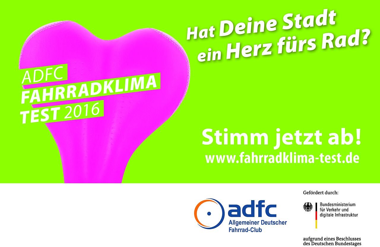 Ab sofort läuft die Umfrage zum großen ADFC-Fahrradklima-Test 2016. Der Fahrrad-Club ruft gemeinsam mit dem Bundesministerium für Verkehr und digitale Infrastruktur wieder hunderttausende Radfahrerinnen und Radfahrer dazu auf, die Fahrradfreundlichkeit von Städten und Gemeinden zu bewerten...