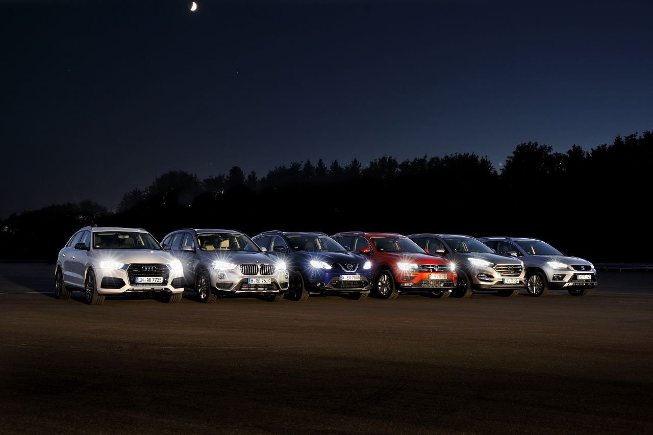 Ein Vergleichstest von Scheinwerfern mit lichtemittierenden Dioden (LED) bei SUV-Modellen bringt es an den Tag: Alle sechs untersuchten Fahrzeuge (VW Tiguan, Audi Q3, BMW X1, Seat Ateca, Hyundai Tucson, Nissan Qashqai) zeigen eine gute bis sehr gute Ausleuchtung...