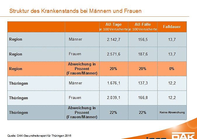 Ein Fazit: Frauen in Thüringen fehlen häufiger im Job als Männer. Ihr Krankenstand lag im vergangenen Jahr 22 Prozent höher. Im Landkreis Nordhausen und im Kyffhäuserkreis betrug der Unterschied 20 Prozent. Damit ist der viel zitierte kleine Unterschied größer als gedacht, sagt Jörn Sola. Die Studie zeigt auch, dass Männer und Frauen von ganz unterschiedlichen Krankheiten betroffen sind.