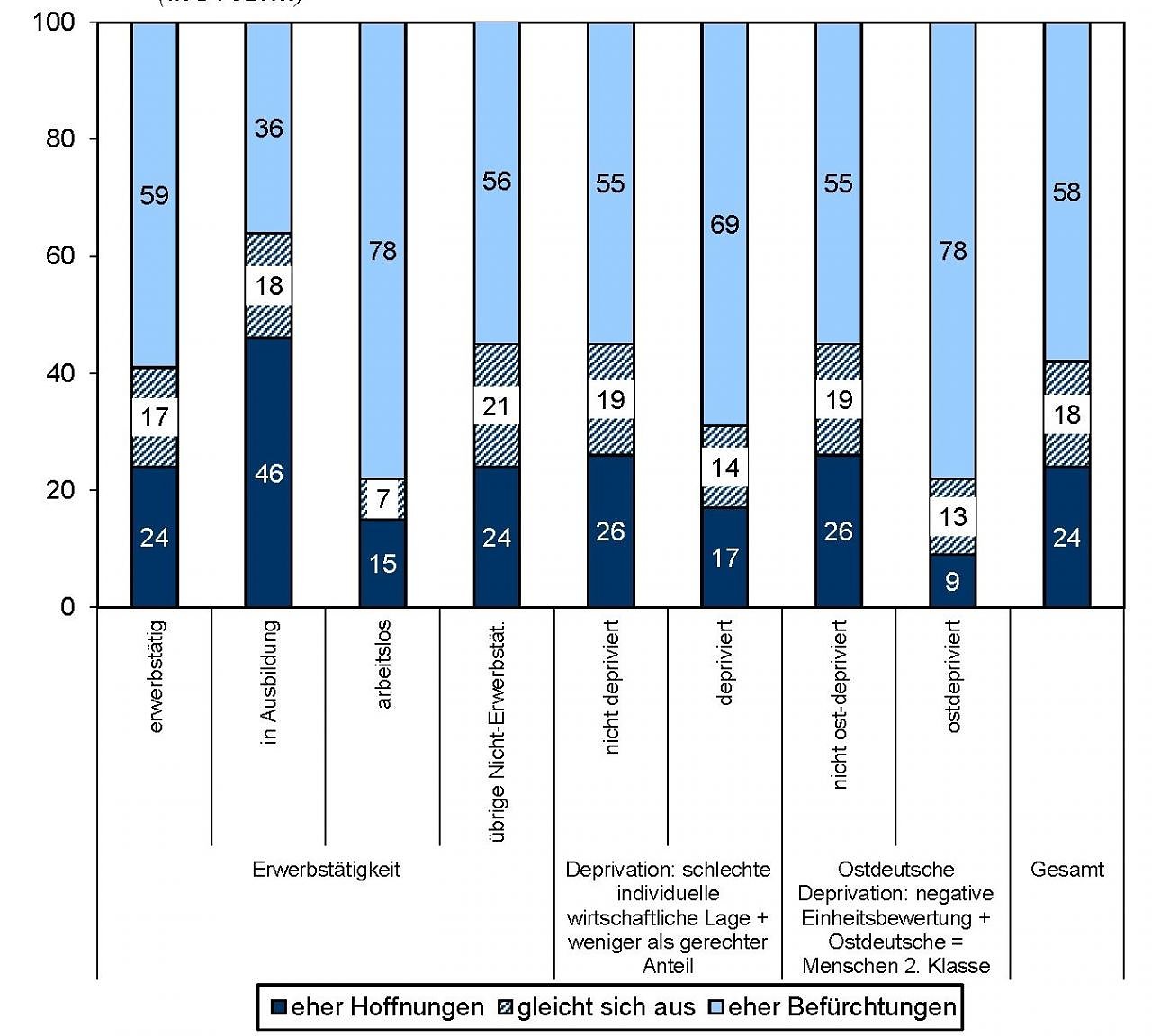 Hoffnungen oder Befürchtungen angesichts der gestiegenen Zahl von Flüchtlingen und Asylsuchenden: Erwerbstätigkeit und Gefühl der Entbehrung, des Entzuges, des Verlustes oder der Isolation von etwas Vertrautem sowie das Gefühl einer Benachteiligung. (Foto: Thüringen Monitor)