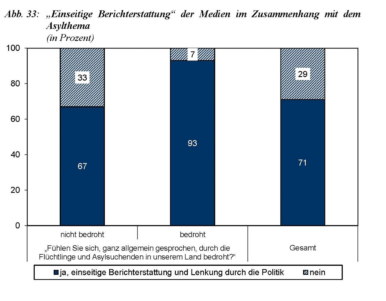 Das ist in erster Linie auf den Rückgang der neo-nationalsozialistischen Einstellungen von 9 auf 6 Prozent zurückzuführen. Die Zustimmung zur Aussage, dass Deutschland durch Ausländer in gefährlichem Maße überfremdet sei, (52 Prozent) hat sich jedoch gegenüber dem Vorjahr statistisch nicht signifikant verändert. Ein ähnliches Bild ergibt sich bei der Aussage, dass unser Land heute ein hartes und energisches Durchsetzen deutscher Interessen gegenüber dem Ausland brauche.