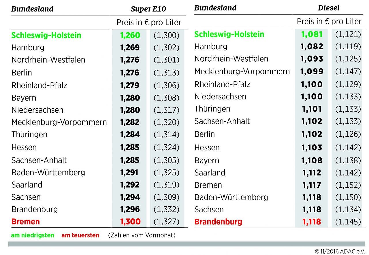 Das sind 3,7 Cent mehr als in Schleswig-Holstein, das auch beim Diesel am preiswertesten ist. Nordrhein-Westfalen, das bevölkerungsreichste Bundesland, liegt pünktlich zum Karnevalsauftakt bei beiden Sorten mit 1,276 Euro (Super E10) und 1,093 Euro (Diesel) jeweils auf einem guten dritten Platz im Länder-Ranking.