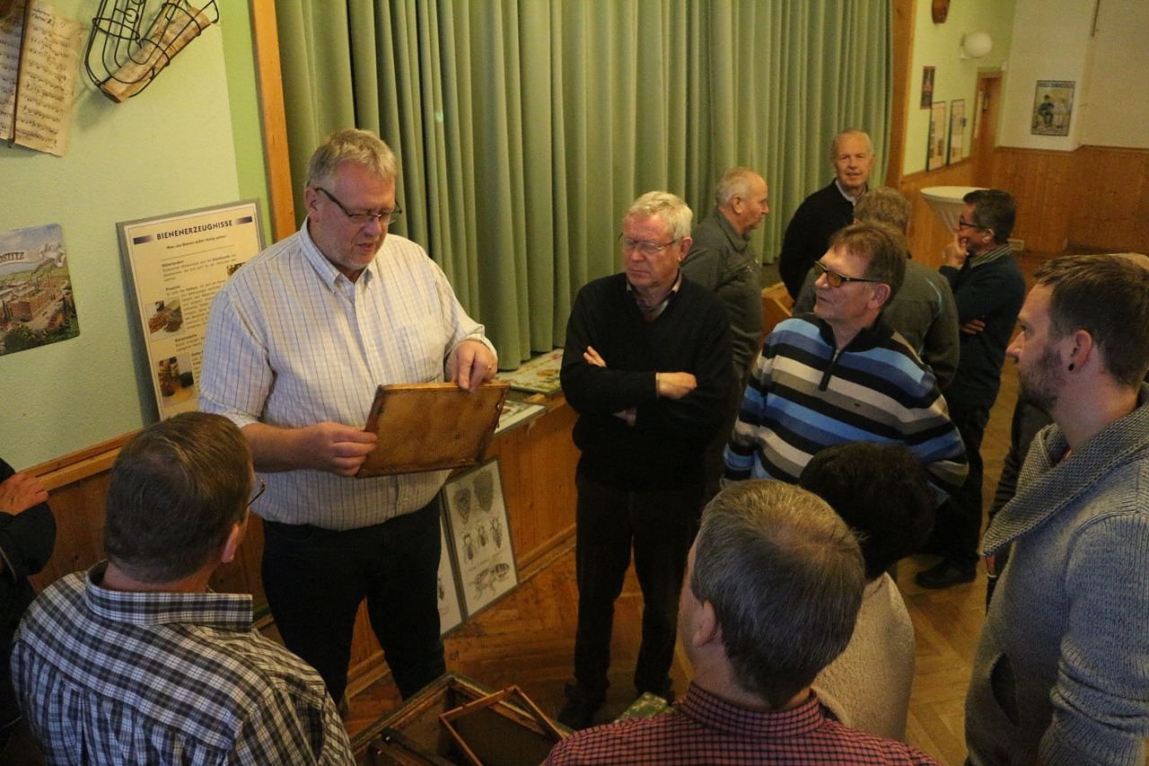 Letzteres ist die natürliche Art und Weise der Bienenvölker sich zu vermehrren. Der Schwarm spaltet sich, die alte Königin macht einer neuen Platz und nimmt einen Teil ihres Hofstaates mit sich. Bienen sind wilde Tiere, die hören auf kein Kommando und machen was sie wollen, erklärte Danner seinen Zuhörern, die Kunst des Imkerns besteht darin, sich die natürlichen Verhaltensweisen der Tiere bei der Schwarmpflege zu nutze zu machen. Das Bienenjahr beginnt zwischen Februar und März, da regt es sich so langsam in der Natur und auch im Bienenstock. Bis dahin haben die Bienen eng beieinander hängend in ihrer angenehm temperierten Heimstatt verbracht und von ihren Vorräten gezehrt. Die erste Honigernte erwartet man im Juni, Ende August geht das Jahr der Biene auch schon wieder seinem Ende entgegen. Den Imker beschäftigt noch die Beutenpflege und die Vorbereitungen für das kommende Jahr. Wichtig und vom Gesetz vorgegeben ist der Kampf gegen Krankheitserreger wie die Varroamilbe. Die wurde vom Menschen aus dem asiatischen Raum eingeschleppt, die hiesigen Bienen haben den Plagegeistern nicht viel entgegen zu setzen. Ein wilder Schwarm hat heute eigentlich keine Chance mehr, sagt der Imker. Die Milben setzen sich auf die Larven, die fertigen Bienen kommen verkrüppelt zur Welt, der Schwarm stirbt Stück für Stück, wenn der Mensch nicht helfend eingreift. Methoden den Milben zu Leibe zu rücken gibt es verschiedene, vom Einsatz von Ameisensäure und ätherischen Ölen bishin zu medizinischen Präparaten.