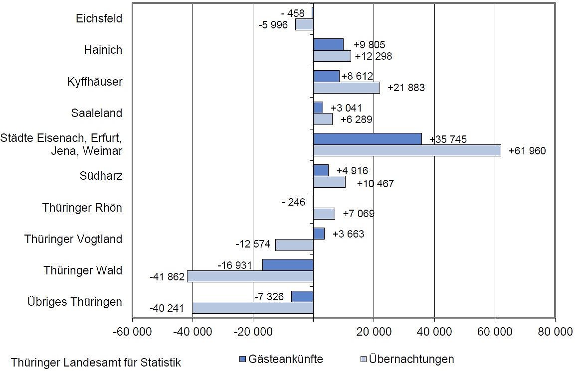 Nach Reisegebieten betrachtet verlief die Entwicklung recht unterschiedlich. Der Städtetourismus (Städte Eisenach, Erfurt, Jena und Weimar) sowie einige kleinere Reisegebiete (Kyffhäuser, Hainich, Südharz, Saaleland) konnten sowohl in den Gästezahlen als auch in der Zahl der Übernachtungen zulegen.