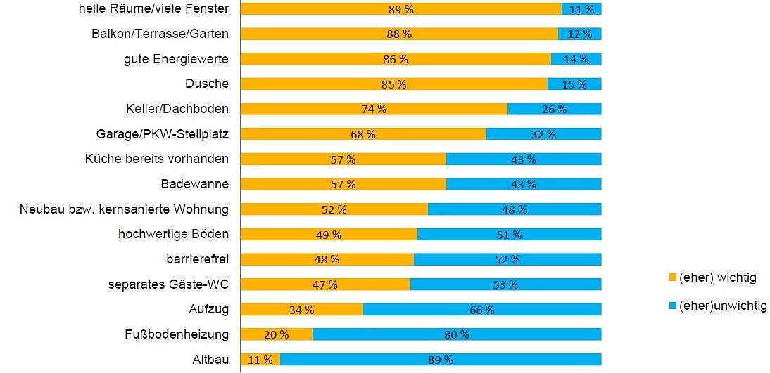 Sie sind auf Wohnungssuche: Wie wichtig sind Ihnen folgende Merkmale? (Antwortmöglichkeiten: (eher) wichtig / (eher) unwichtig, Mehrfachantworten möglich)
