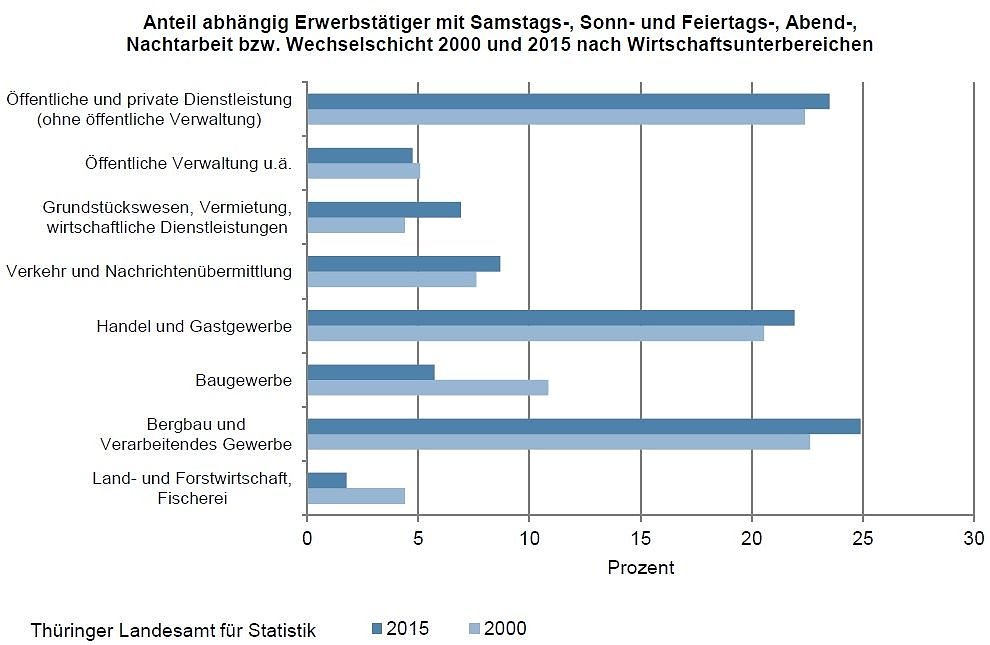 Im Jahr 2015 beträgt nach Mitteilung des Thüringer Landesamtes für Statistik die Zahl der abhängig Erwerbstätigen 907.000 Personen. Das sind 15.000 Erwerbstätige weniger als im Jahr 2000. Die Anzahl der Erwerbstätigen, die abends, nachts, an Samstagen oder Sonntagen und in Schichten arbeiten, ist zwischen den Jahren 2000 (433.000) und 2015 (506.000 um 17 Prozent gestiegen...