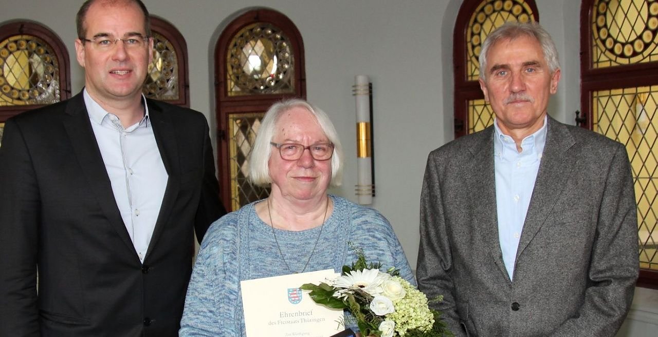 Mit dem Ehrenbrief des Freistaats Thüringen hat heute Landrat Matthias Jendricke Dr. Jutta Scholz vom Verein Dritte Welt Initiative Nordhausen ausgezeichnet. Diese besondere Ehrung des Ministerpräsidenten Bodo Ramelow würdigt das jahrelange ehrenamtliche Engagement der Nordhäuserin...