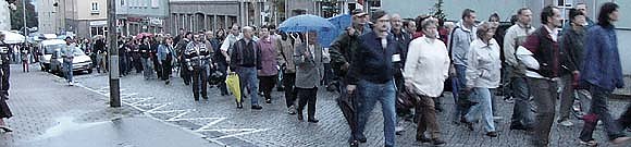 Im Anschluß an die Kundgebung zogen die 1.800 Menschen wieder durch die Stadt. Sie haben den Kanal voll, auch strömender Regen kann sie nicht mehr vom Protest abhalten.