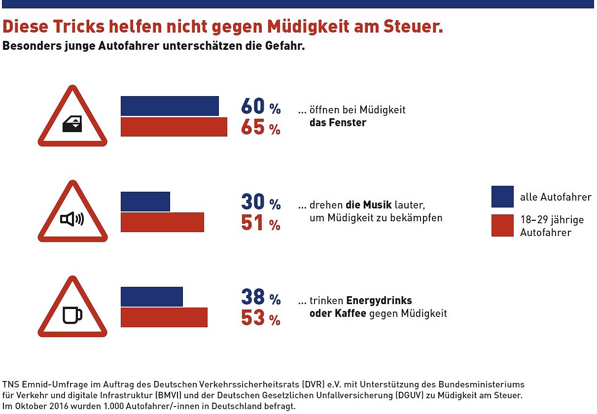 Im Rahmen der Kampagne Vorsicht Sekundenschlaf! Die Aktion gegen Müdigkeit am Steuer. mit Unterstützung des Bundesministeriums für Verkehr und digitale Infrastruktur (BMVI) und der Deutschen Gesetzlichen Unfallversicherung (DGUV) wurden 1.000 Autofahrerinnen und Autofahrer befragt.