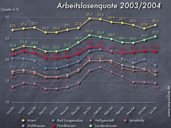 Die Arbeitslosigkeit im Landkreis Nordhausen hat sich im August geringfügig verringert, und zwar um 46 auf 9.713. Im Vergleich zum Vorjahr gab es 121 Arbeitslose weniger. Die Arbeitslosenquote, berechnet auf der Basis aller abhängigen Erwerbspersonen, betrug im August 22,0 %. Vor einem Jahr hatte sich die Quote auf 22,1 % belaufen.