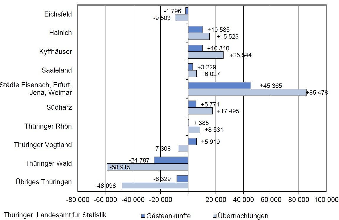 Der Thüringer Wald, als größtes Thüringer Reisegebiet, musste in den ersten elf Monaten des Jahres 2016 hingegen einen Rückgang der Gästezahlen (- 1,9 Prozent) und Übernachtungen (- 1,5 Prozent) in Kauf nehmen, noch deutlicher fiel der Rückgang im Reisegebiet Übriges Thüringen aus (zu dem die Kreise Sömmerda, Weimarer Land und der überwiegende Teil des Altenburger Landes gehören) (Gäste: - 3,2 Prozent, Übernachtungen: - 6,0 Prozent).
