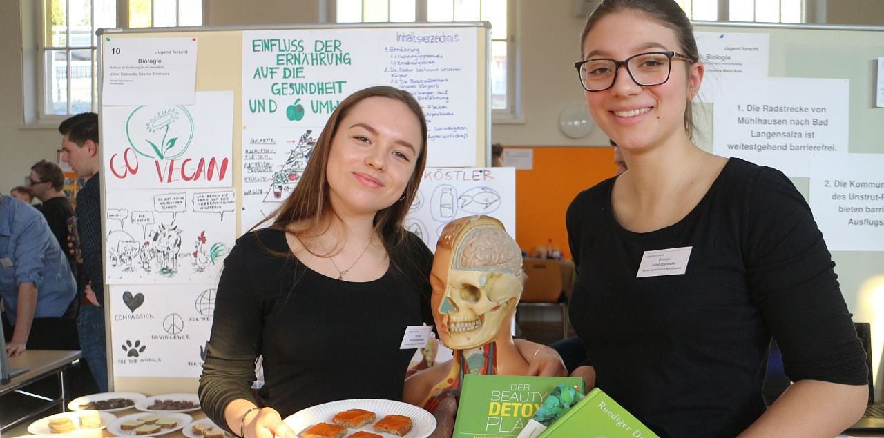 Laura, Pia und Rebecca vom Käthe-Kollwitz Gymnasium in Lengenfeld unterm Stein etwa befassten sich mit der Auswirkung von Musik auf Psyche, Intelligenz und Kaufverhalten. "Dafür das klassische Musik kleine Kinder intelligenter macht gibt es zum Beispiel keine Belege", erklärt Laura, allgemein sei es nicht so sehr das Musik hören, das Fähigkeiten wie Koordination, Erinnerungs- und Einfühlvermögen fördere, sondern vielmehr das Musik machen. Einige Stände weiter präsentieren Juliet und Dascha vom Nordhäuser Herder-Gymnasium ihre Ergebnisse. Die beiden haben im Selbstversuch getestet wie sich vegane und vegetarische Lebensweise auf den Körper auswirken. Beim für die fleischlose Ernährung bekannten Eisenmangel hätten ihre Blutwerte widersprüchliche Daten geliefert, erklärt Juliet, deutlicher sei ein Mangel an Folsäure und Vitamin B12 gewesen, aber nicht signifikant. Im weiteren Verlauf ihres Projektes haben sich die beiden dann auch die Auswirkungen der Fleischwirtschaft auf Tiere und Umwelt angesehen. Problematisch sei unter anderem die großflächige Rohdung von Flächen für den Anbau von Sojakulturen als Futtermittel-Lieferant.