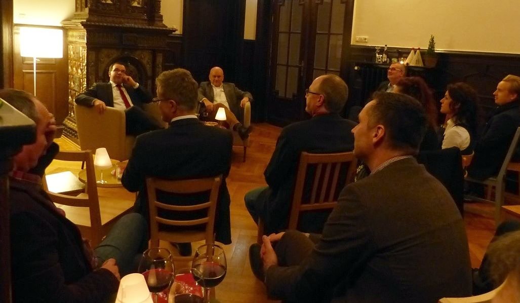 Davor saß man in interessierter Runde und diskutierte angeregt mit Gastgebern und Referenten. Am ersten Abend im Dezember wurde der Vize-Präsident des Bundesnachrichtendienstes und Beauftragter für Wirtschaftsschutz und Geheimdienstbeauftragter, Guido Müller, begrüßt.