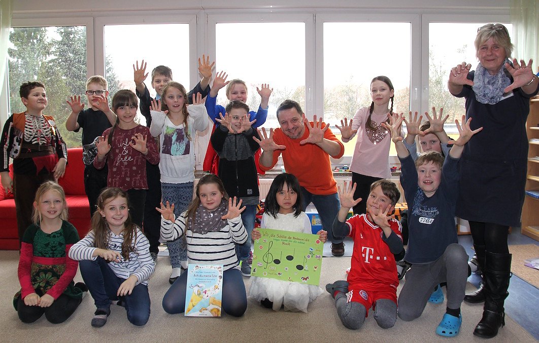 Schülerinnen und Schüler der 3. Klasse, Komponist Jens Pappe (Bildmitte) und Musiklehrerin Claudia Berz (Rechts) (Foto: Sylvia Spehr)