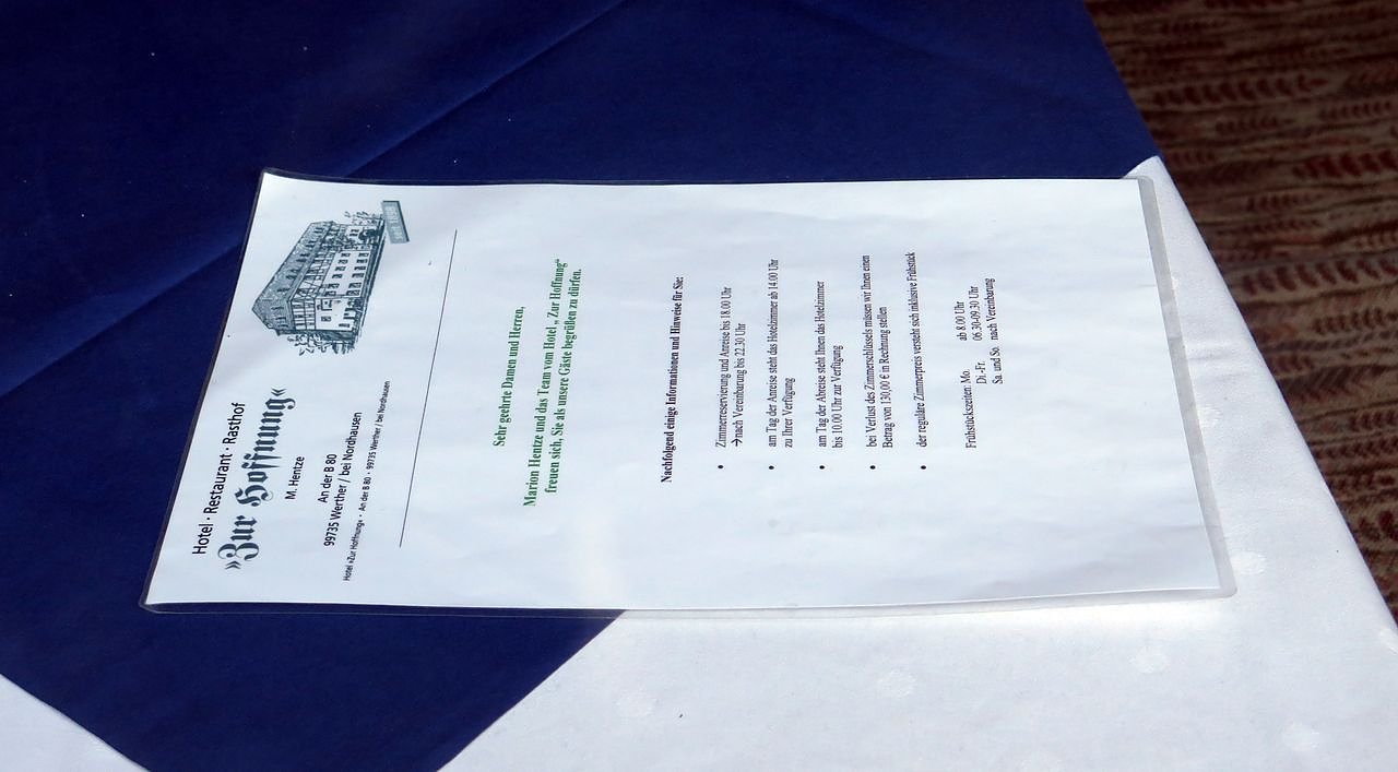 Ein uraltes Merkblatt auf einem der ansonst leere Restauranttische (Foto: nnz)