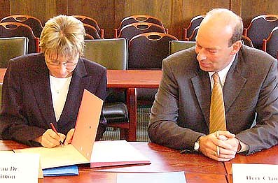 Nordhausen (nnz). Mit einem (fast) Festakt ist heute der Vertrag zur Gründung einer Arbeitsgemeinschaft zwischen der Nordhäuser Arbeitsagentur und dem Landratsamt unterzeichnet worden. Und da wurde in vielen Reden eigentlich sich nur selber gedankt.Im Plenarsaal des historischen Landratsamt wurde der Festakt zelebriert. Attestiert wurden die Chefin der Arbeitsagentur, Dr. Simone Simon, und Landrat Joachim Claus dann auch noch durch den Leiter der Regionaldirektion Sachsen-Anhalt/Thüringen, Max-Volker Dähne. Zuerst gab es viele Reden. Da berichtete die zweite Beigeordnete der Kreisverwaltung, Loni Grünwald, noch einmal den Anwesenden und Wissenden die Vorgeschichte des Vertragswerkes (siehe nnz-Archiv). Und Loni Grünwald bedankte sich natürlich bei allen Beteiligten, weil alles bisher so hervorragend geklappt hat. Auch Landrat Claus war in seiner kurzen Rede voll des Dankes an Georg Müller, Loni Grünwald, Matthias Jendricke (alle Kreisverwaltung), an den Kreistag selbst und natürlich an Dr. Simone Simon. Die wiederum dankte sofort den Mitarbeitern des Landratsamtes für die bisherige Zusammenarbeit.