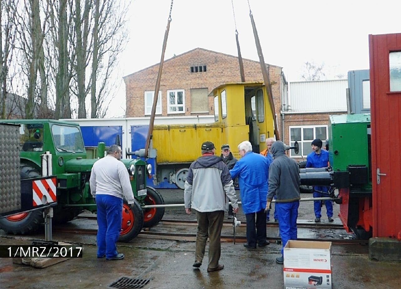 Der Startschuss für den Umbau 2017/18 erfolgte nun am 1. März mit der Umsetzung der Lok H2 auf das Gleis im Lokschuppen des IFA-Museum. Natürlich ging es nicht ohne den Kran der Firma WIEMANN und nicht ohne die Helfer aus dem Museum, die Schlosser und die Vereinsmitglieder.