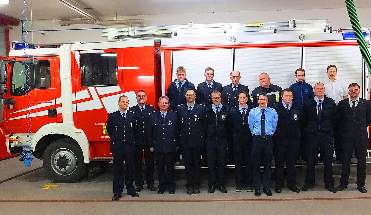 Kamerad Thomas Stolze wurde die bronzene Brandschutzmedaille für 10jährige aktive und pflichttreue Dienstzeit in der Feuerwehr verliehen. Die Kameraden Thomas Apitius, Marcel Steinecke und Burkhard Keil wurden mit dem silbernen Brandschutzehrenzeichen am Bande für 25jährige Mitgliedschaft in der Freiwilligen Feuerwehr ausgezeichnet. Das große Brandschutzehrenzeichen am Bande für 50jährige Dienstzeit nahmen voller Stolz die Kameraden Fritz Bodenberger, Gerhard Bönsch und Karl-Heinz Krüger entgegen. Thomas Evers zeichnete den Bürgermeister der Stadt Bleicherode mit der Ehrennadel des Kreisfeuerwehrverbandes in Gold aus. Im Auftrag des Vorsitzenden des Landesfeuerwehrverbandes verlieh Kamerad Evers Burkhard Keil die Ehrennadel des Thüringer Feuerwehrverbandes für Verdienste um das Thüringer Feuerwehrwesen.
