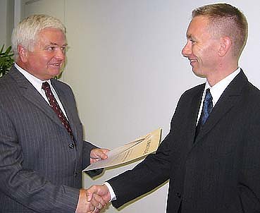 Aus diesem Grunde hat stellvertretend für Dieter Feuer, der Geschäftsführer des Nordhäuser Werkes, Oliver Wönnmann eine Urkunde von Volker Beiersdorf vom BVMW entgegen genommen. Damit wird Herr Feuer für sein außergewöhnliches unternehmerisches Engagement geehrt.