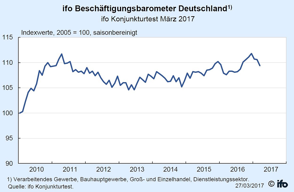 barometer sank im März auf 109,4 Punkte von 110,6 Punkten im Vormonat. Die große Einstellungsdynamik des letzten Jahres hat sich damit etwas abgeschwächt...