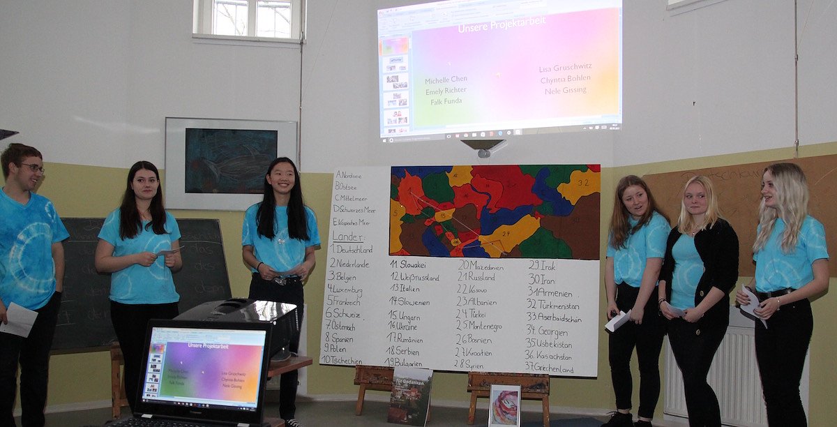 Falk, Emely, Michelle, Lisa, Cynthia, Nele. Sie präsentieren ihre Projektarbeit Integrationshilfe für Kinder und Jugendliche aus Kriegsländern vor der Prüfungskommission