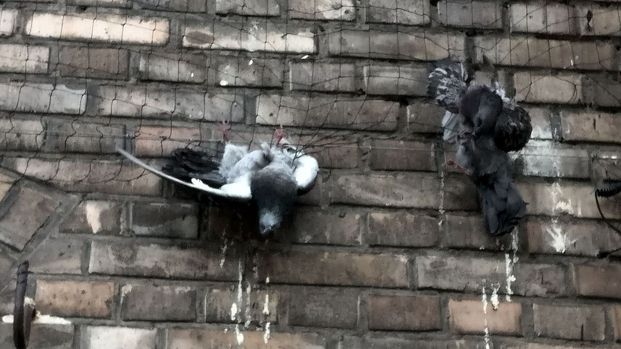 In Netzen, die wohl als Schutz für Passanten gedacht sind, hängen tote und verweste. Kein schöner Anblick. Wie die Tauben zu Tode gekommen sind, kann nur spekuliert werden. Ob sie einfach mit einen Luftgewehr abgeschossen oder vielleicht durch Gift ums Leben gekommen sind, ist schwer zu sagen.