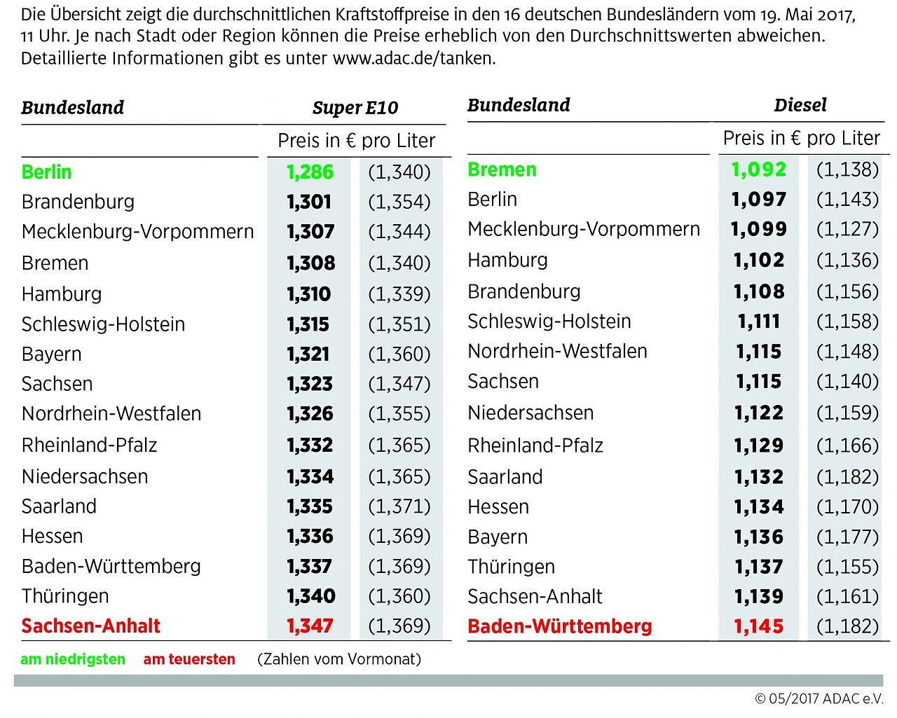 Auf dem zweiten Platz folgt Brandenburg mit 1,301 Euro je Liter, auf Platz drei Mecklenburg-Vorpommern mit 1,307 Euro.