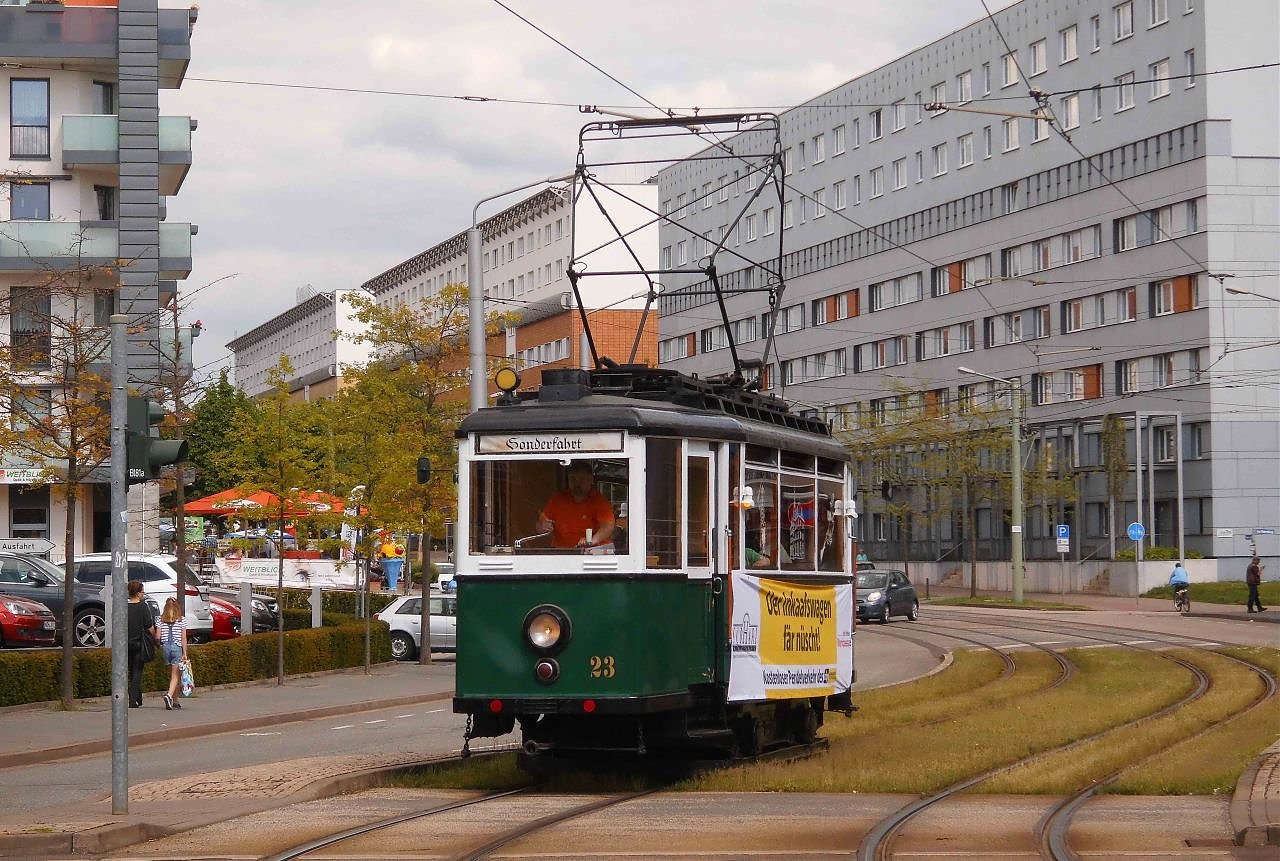 Korrekt geschrieben, handelt es sich um den TW 23, den Bernd Thielbeer in der Töpferstraße "erwischte". Dieser Triebwagen wurde 1934 in Wismar gebaut. In Nordhausen wird er zu besonderen Anlässen aus dem Depot geholt und eingesetzt.
