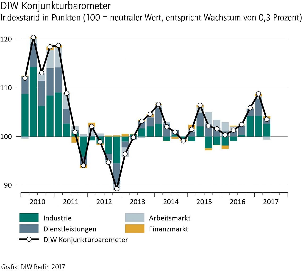 Das DIW Konjunkturbarometer liegt für das laufende zweite Quartal bei 104 Punkten deutlich über der 100-Punkte-Marke, die einen durchschnittlichen Zuwachs des Bruttoinlandsprodukts anzeigt. Die deutsche Wirtschaft befindet sich derzeit in einer echten Frühjahrseuphorie, sagt DIW-Konjunkturchef Ferdinand Fichtner. Für die kommenden Quartale ist aber mit einem etwas geringeren Tempo zu rechnen.