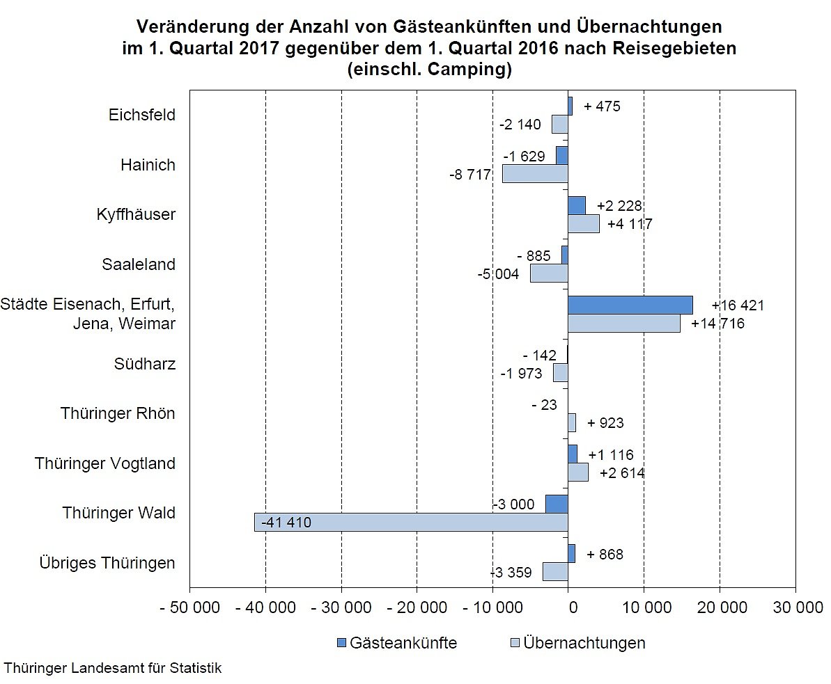Betrachtet man die Tourismusentwicklung in den Thüringer Reisegebieten, so gab es auch im 1. Quartal 2017 deutliche Unterschiede. Neben dem Städtetourismus (Eisenach, Erfurt, Jena und Weimar) erreichten weitere Reisegebiete (Kyffhäuser und Thüringer Vogtland) mit einem deutlichen Plus bei den Gäste- und Übernachtungen einen guten Start in das Tourismusjahr 2017. Herbe Einbußen gab es im Thüringer Wald, im Hainich oder im Südharz.
