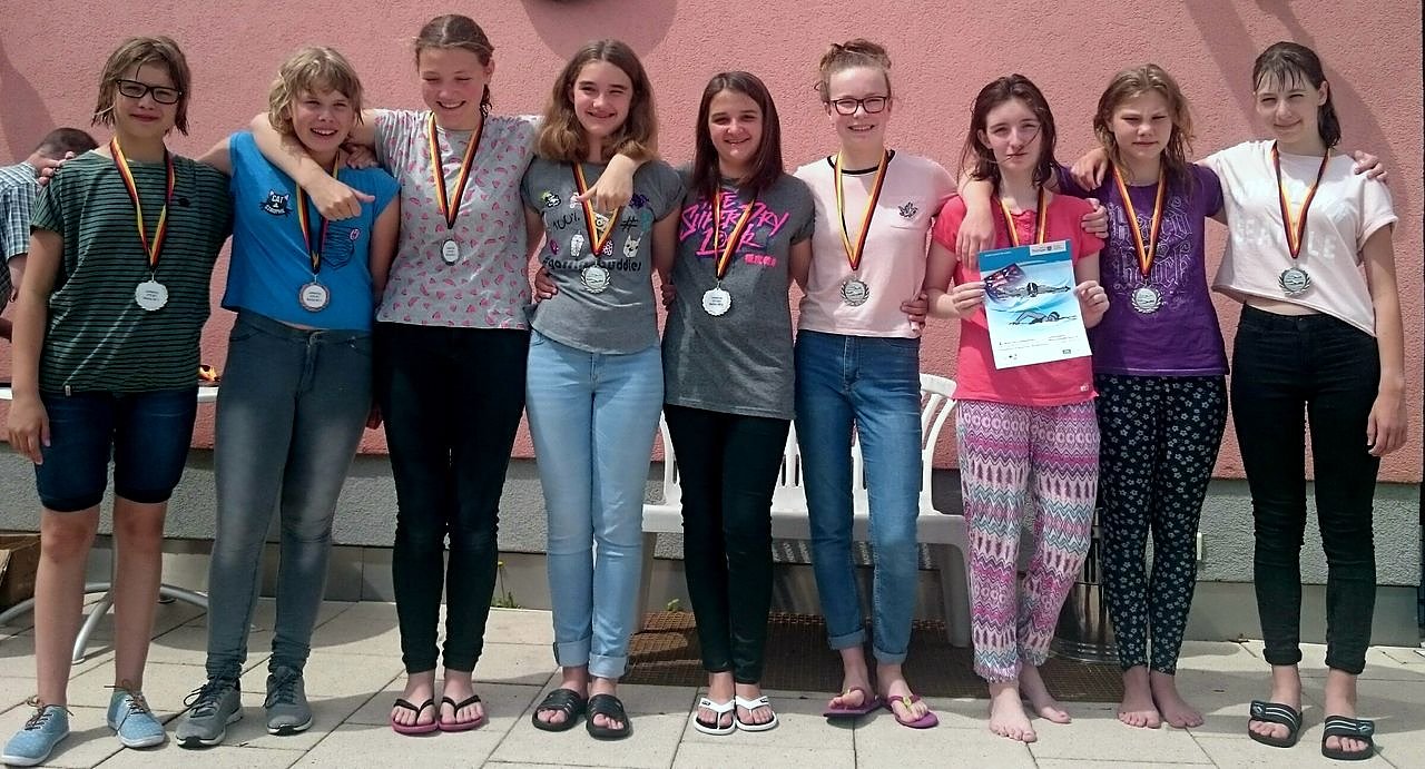 Die Damen der Wettkampfklasse IV hatten zwar nur zwei Gegner, wollten aber nach ihren fünf Wettkämpfen gerne auf dem Silbertreppchen stehen. In guten Händen bei Trainerin Pia Pfitzmann erschwammen sich Nele Pfitzmann, Katharina Grafe, Veronique König, Andrea Krist, Gina Finger, Clara Presacco, Emely Hatzky, Line Schneeberg und Helene Jätschmann mit einer Gesamtzeit von 15:48,77min und mehr als einer Minute Vorsprung am Ende tatsächlich die Silbermedaille. Das Sportgymnasium belegte auch hier Platz 1; das Friedrich-Schiller-Gymnasium Weimar Platz 3.