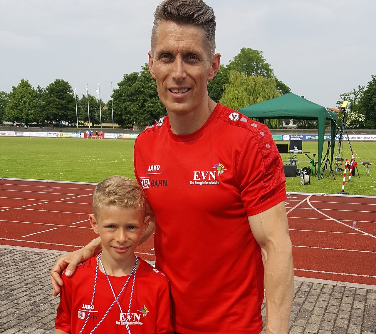 Sohn Damian, in der Altersklasse M 9 startend, siegte in einem großen Teilnehmerfeld im Dreikampf (Ballwerfen, 50-Meter-Lauf, Weitsprung). Die Basis für den Erfolg waren hierbei seine persönlichen Bestleistungen im 50-Meter-Lauf (8,27 Sekunden) und im Weitsprung (3,92 Meter).