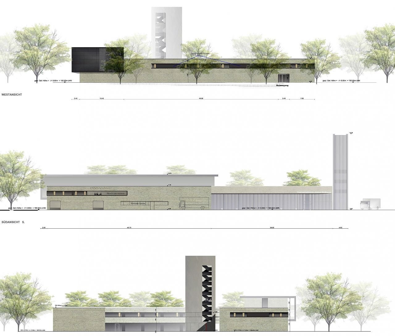 Aus fachlicher Sicht entspricht die vorliegende Entwurfsplanung dem aktuellen Stand der Technik sowie den geltenden Vorschriften und lässt eine langfristige Nutzung des Gebäudes erwarten. Der Entwurf beinhaltet einen Mindeststandard an Raumbedarf. Eine spätere Erweiterung ist jedoch möglich. Gemäß dem zur Entwurfsplanung gehörenden Raumbuch beträgt die Gesamtfläche im Gebäude 4.800 m². Diese gliedert sich in 834 m² Technik- und Verkehrsfläche, 115 m² Terrassen, 70 m² Schlauchturm und 3.781 m² Nutzflächen (Büros, Werkstätten, Fahrzeughalle).