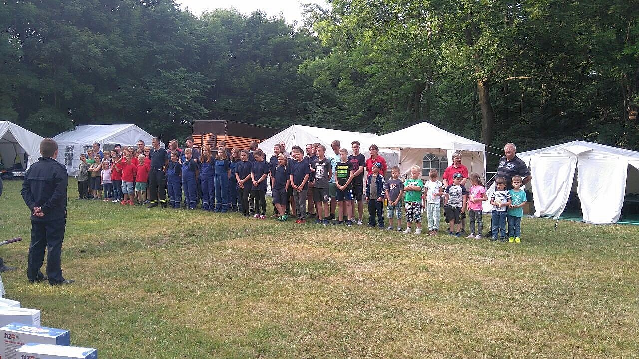 Am Samstagvormittag, ging es erst einmal für die Mutigsten auf den Kletterturm. Anschließend brachen die etwas mehr als 40 Kinder und Jugendlichen aus den Wehren im Alter zwischen 6 und 17 Jahren mit ihren Betreuern zum durch die Lagerleitung geplanten Stationsbetrieb auf. Ob beim Schläuche flechten, Knoten blind anfertigen, Inselhüpfen, Luftballon fegen, einer Hosen-Ralley oder dem Wikingerschach mussten die Teilnehmer höchste Geschicklichkeit und Schnelligkeit an den Tag legen. Hierbei kam es sehr auf die Zusammenarbeit und Kameradschaft unter den Kameradinnen und Kameraden der einzelnen Wehren an.