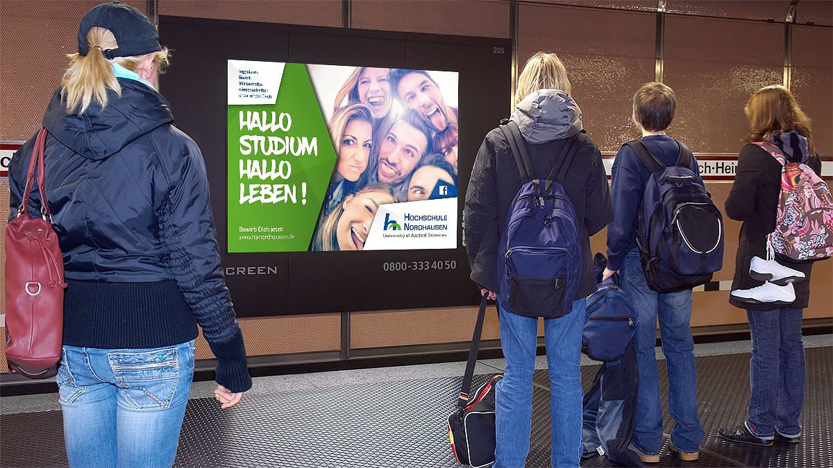 Auch aus diesem Grund setzen die Hochschulen seit Jahren vermehrt auf ihre Werbung. Die Hochschule Nordhausen startet jedes Jahr gleich mehrere Kampagnen, um die jungen Menschen auf sich aufmerksam zu machen. Dies beginnt bei Großveranstaltungen wie dem Hochschulinformationstag bis hin zu umfangreichen Online Kampagnen, Flyerauslagen an Gymnasien in ganz Deutschland, Anzeigenschaltungen, Film- und Videoproduktionen, Kinospotschaltungen sowie Social Media Marketing auf den hochschuleigenen Profilen bei Facebook, Instagram, YouTube und Co.