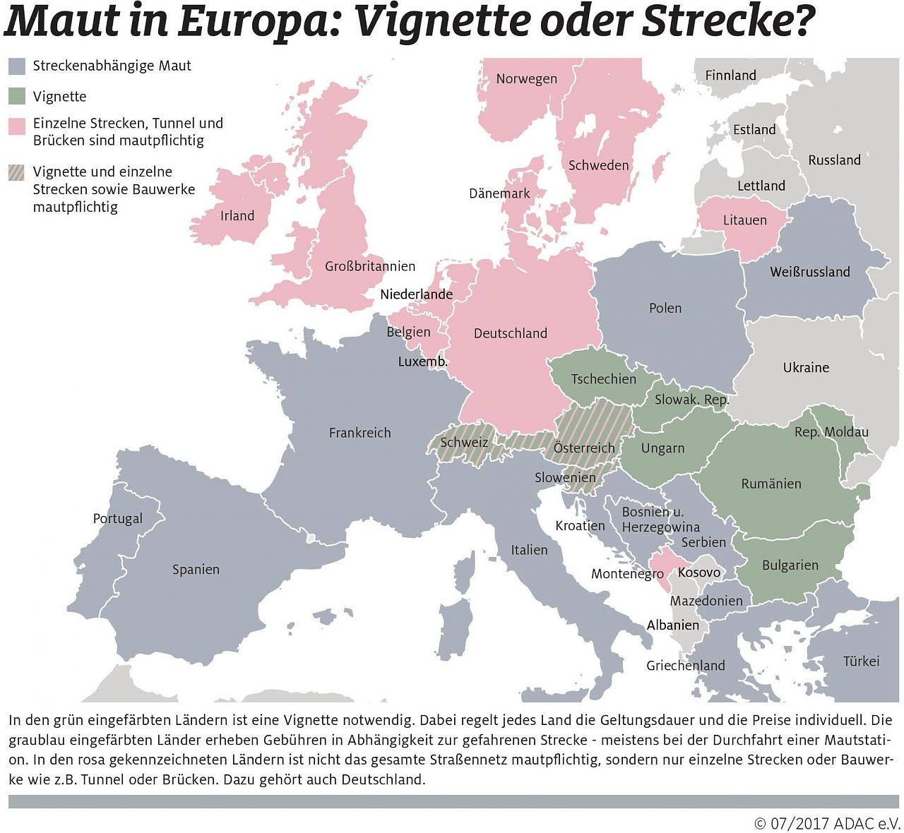 Zudem verlangen einige Länder zusätzlich eine Sondermaut für Brücken, Tunnel und Pässe etwa Österreich, Schweiz, Italien, Frankreich, Dänemark und Schweden. In acht weiteren Ländern benötigen Autofahrer sowohl für Fahrten auf Autobahnen als auch auf Schnellstraßen eine Vignette: in Bulgarien, Österreich, Rumänien, der Schweiz, der Slowakei, Slowenien, Tschechien und Ungarn. Die Vignetten gelten unterschiedlich lange.