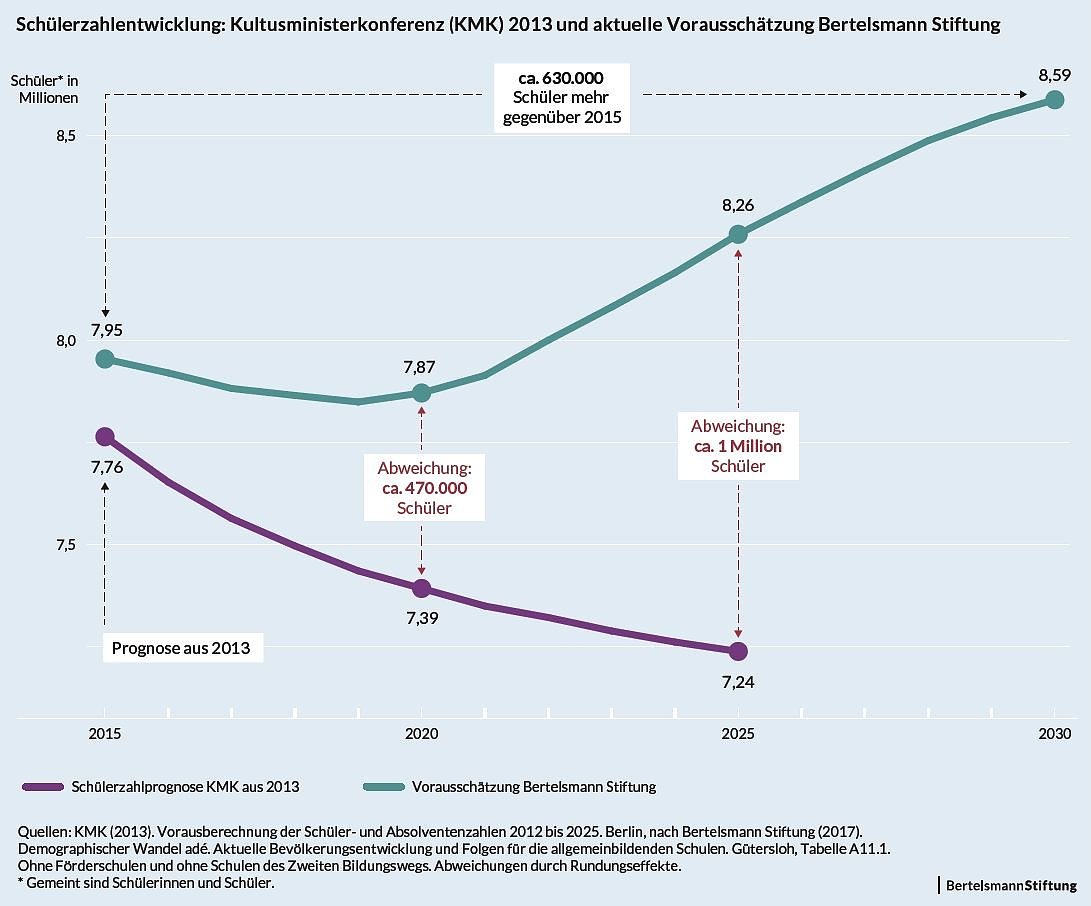Der Traum von der demographischen Rendite ist ausgeträumt. Jetzt gilt es, in zusätzliche Lehrer und Schulen zu investieren, sagt Dräger. Er empfiehlt der KMK, ihre Prognose der Schülerzahlen zu aktualisieren. Die stammt aus dem Jahr 2013, als weder steigende Geburtenraten noch Rekord-Zuwande-rung abzusehen waren. Die Bertelsmann Stiftung erwartet 2025 in den Grundschulen 22 Prozent mehr Schüler als die KMK.