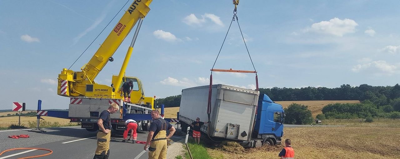 Gegen 13.30 Uhr war ein Brummi mit Auflieger von Sondershausen kommend in Richtung Nordhausen unterwegs. In einer Kurve im Bereich der Fuchsfarm kam der Fahrer von der Fahrbahn ab. Die Zugmaschine und Teile des Auflieger fuhren sich im angrenzenden Feld fest.