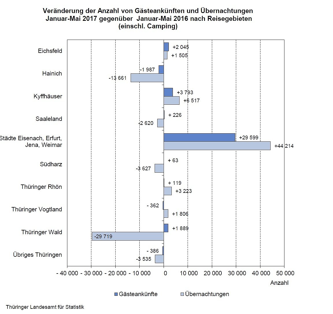 Von Januar bis Mai 2017 empfingen die Thüringer Beherbergungsbetriebe mit zehn und mehr Betten (einschließlich Campingplätze) nach vorläufigen Angaben des Thüringer Landesamtes für Statistik rund 1,4 Millionen Gäste. Die Anzahl der Übernachtungen erreichte in den ersten fünf Monaten des Jahres knapp 3,5 Millionen. Damit stieg die Zahl der Gästeankünfte gegenüber dem entsprechenden Vorjahreszeitraum um 2,6 Prozent, die Zahl der Übernachtungen lag auf dem Niveau des Vorjahres (+0,1 Prozent).