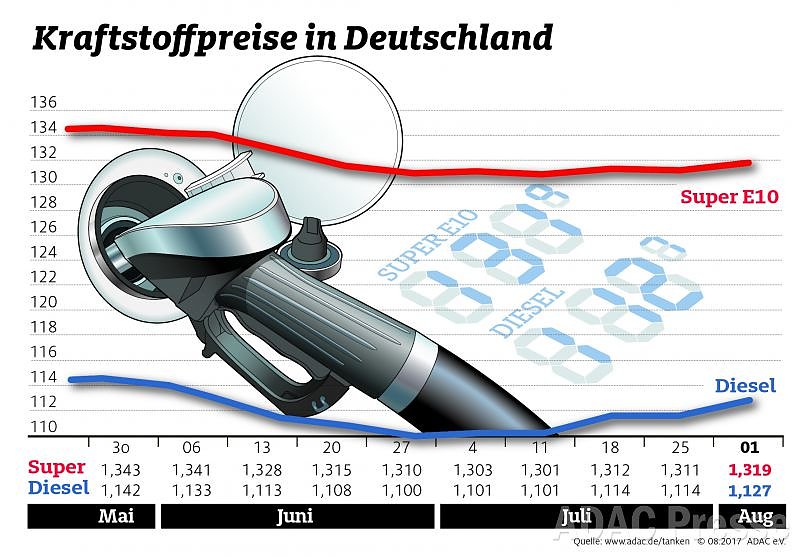 Laut ADAC kostet ein Liter Super E10 durchschnittlich 1,319 Euro und damit 0,8 Cent mehr als in der Vorwoche. Für einen Liter Diesel müssen Autofahrer 1,127 Euro bezahlen: im Vergleich zur Vorwoche ein Anstieg von 1,3 Cent...