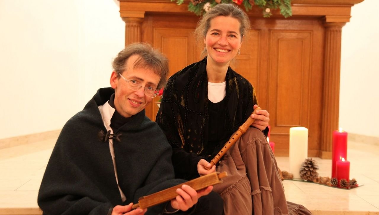 Es musiziert in beiden Orten das Duo Vimaris (Mirjam & Wieland Meinhold) aus Weimar. Zuvor, bei einer Orgelführung bereits um 15:15 Uhr in der Frauenbergkirche erläutert unter dem Motto "Klangmajestät - Besuch bei der Königin" der Weimarer Universitäts-Organist Wieland Meinhold die "Königinnen der Instrumente" hautnah. Direkt neben dem Spieltisch des Instrumentes hat man Gelegenheit zu erfahren, wie der höchste, wie der tiefste Ton klingt. Wie viele Pfeifen stehen in dem Instrument? Wie funktioniert die Übertragung zwischen Taste und Ventil? Wie schwer ist so eine Orgel?... usw.. Immer wieder fesseln diese unterhaltsamen Orgelführungen die Gäste.